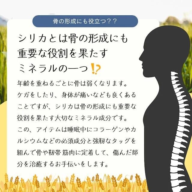 シリカはカルシウムやミネラルの働きを助け、骨の強度を高め、怪我の予防や成長期の骨形成をサポートします。 また、スポーツで酷使した体の回復や再生にも関わり、プロを目指す学生やアスリートにも欠かせない栄養素です。