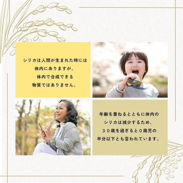 年齢とともに減少するシリカ(ケイ素)は、美容や健康、そして成長に欠かせないミネラルです。 「恵みのシリカ」で、ご自身のために、そして大切なご家族の健康のために、毎日の生活にシリカを取り入れてみませんか?
